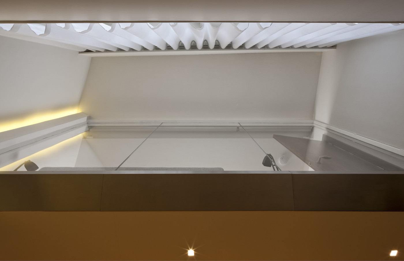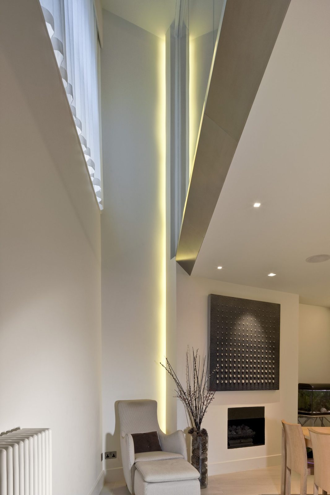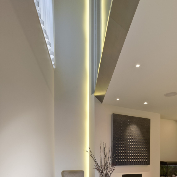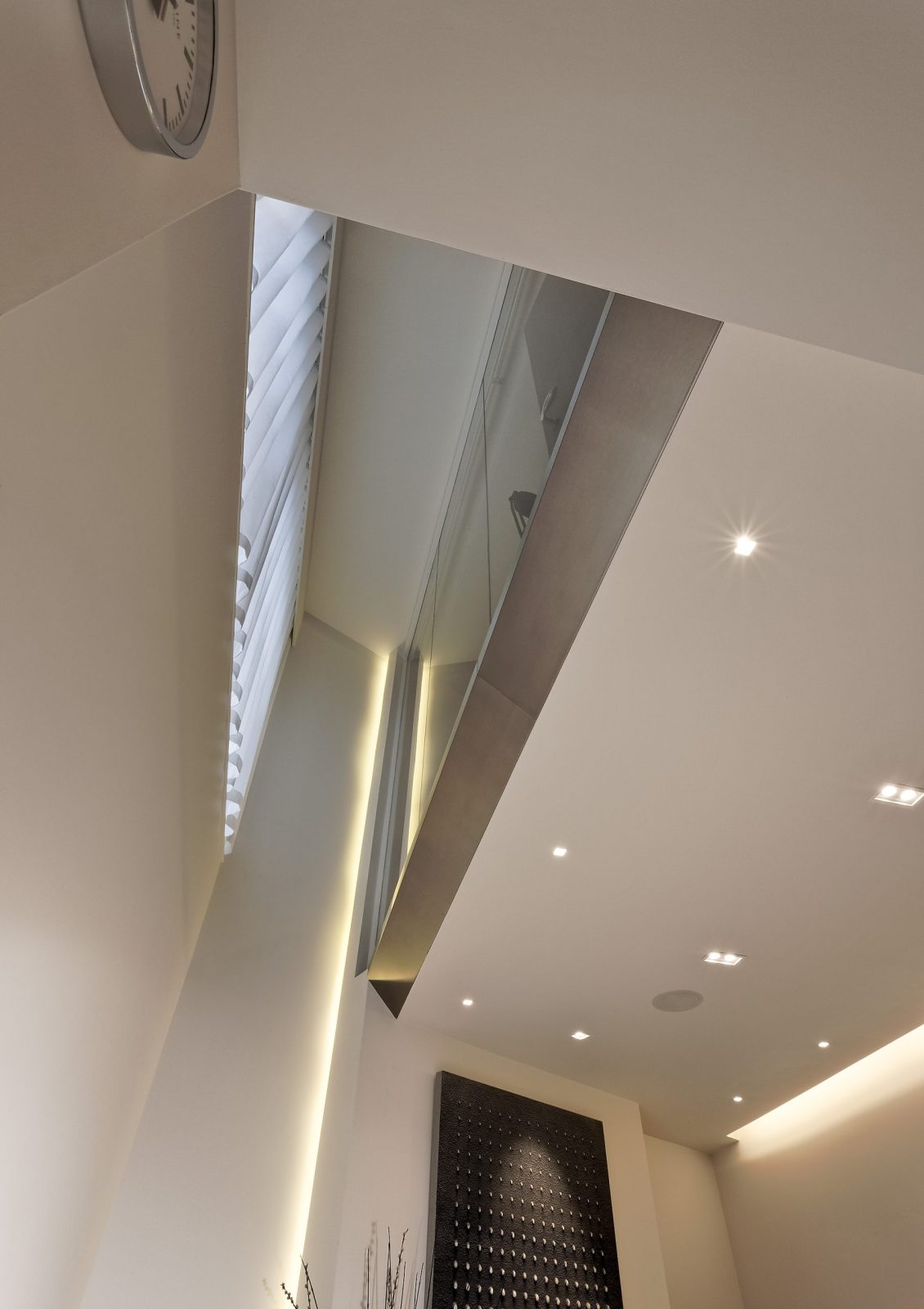 The study’s front wall consists of a fire-rated frameless glass wall that provides borrowed light to the study through the front elevation windows, across the light-slot.