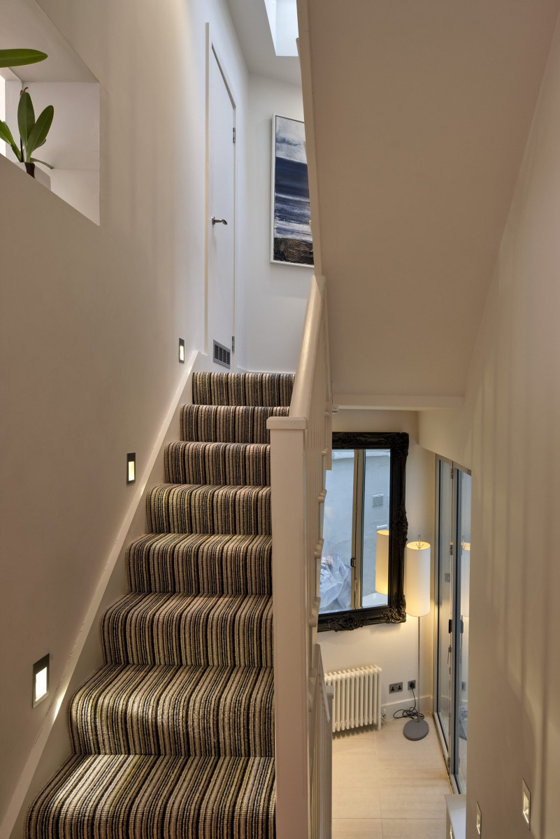 At basement level, the extension provides access to a small patio through generous slim-frame folding sliding glass doors. This, along with the rebuilding of the staircase to a different footprint, has led to the house having a much more generous and light feel, in addition to the creation of extra space.