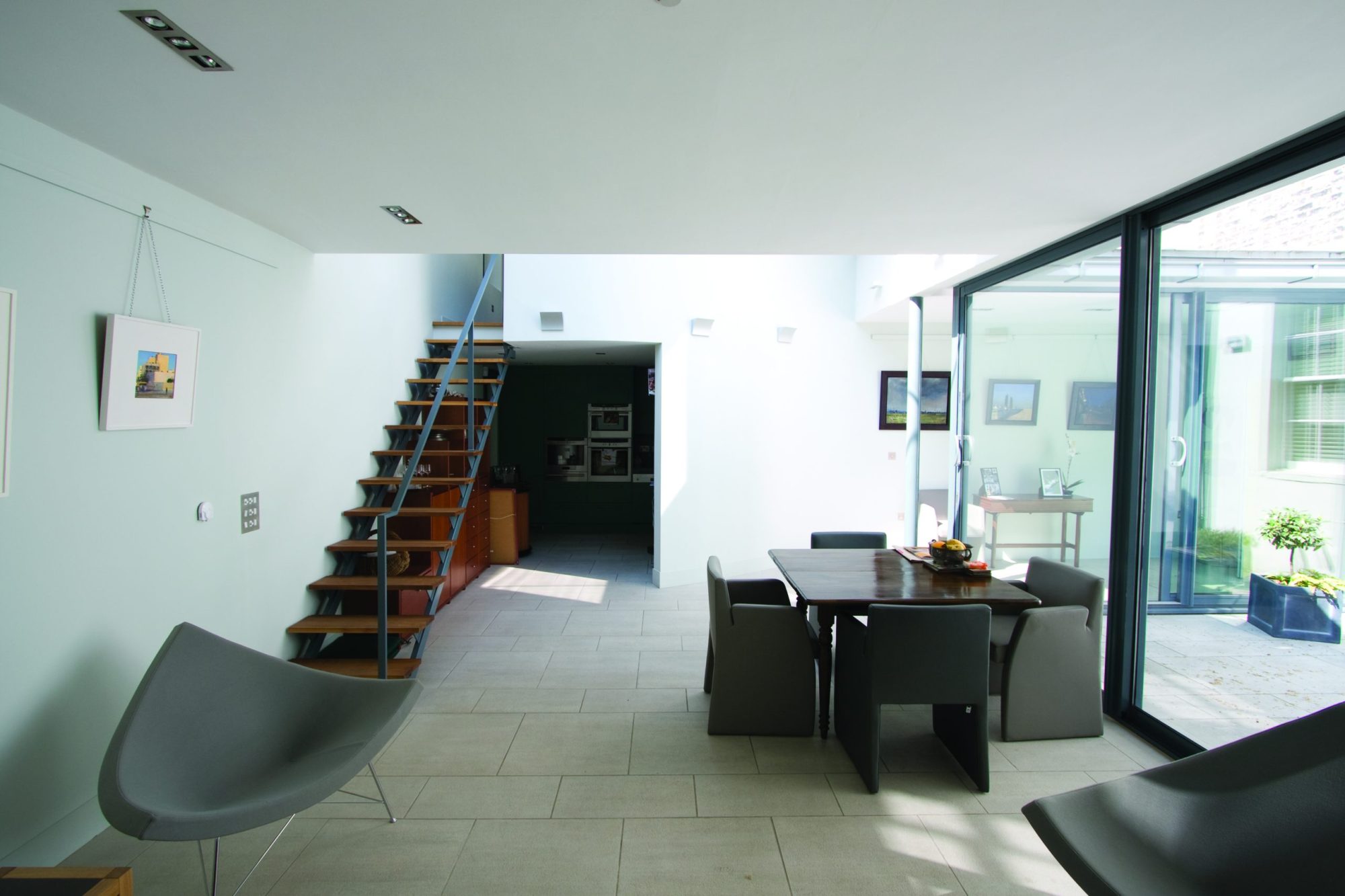 The paved courtyard, enclosed by the new extension and the original house, acts as an outdoor extension of the living accommodation.