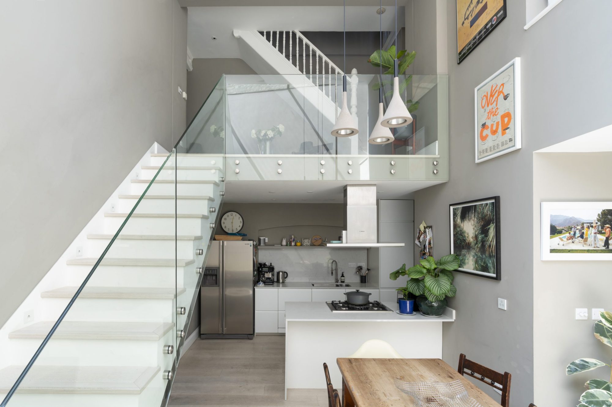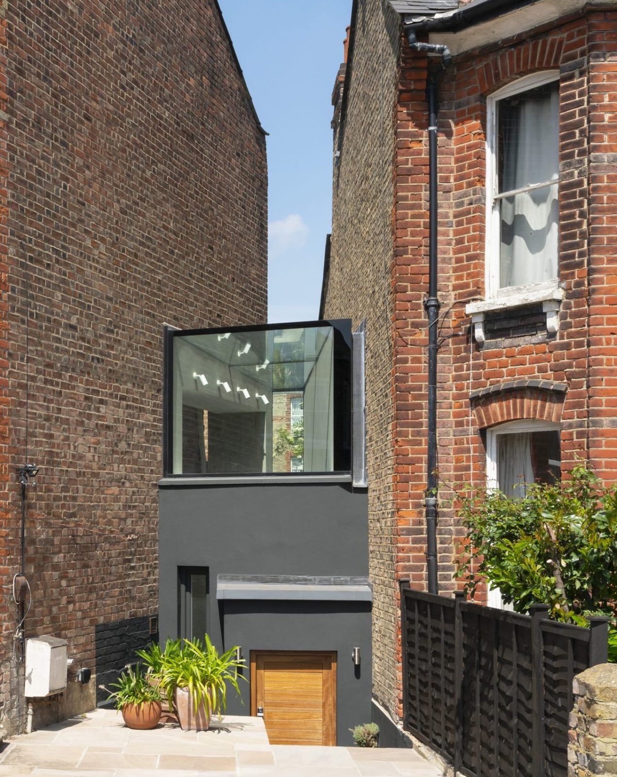 This project was for a side infill extension in the form of a double height glass box. This transformed an isolated, dark, and damp lower ground floor with an unused garden, into a light filled double height volume family room with living, dining and kitchen, from which the garden is accessed, and that is connected to the ground floor through a gallery and modern staircase. The design transformed the use and character of both basement and ground floor accommodation, and of the garden, which has been landscaped by the owners with the feel and function of an additional outdoor family room.