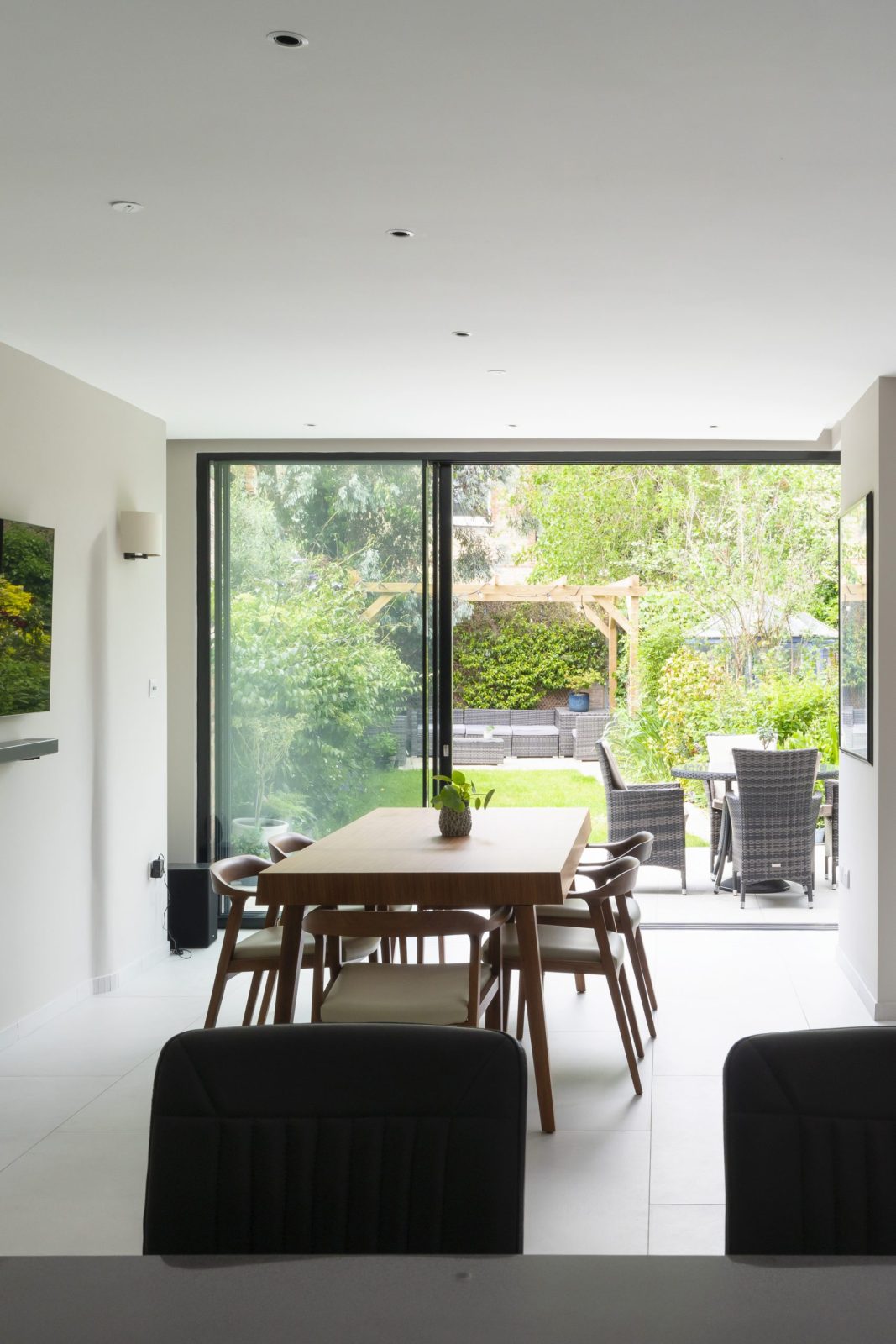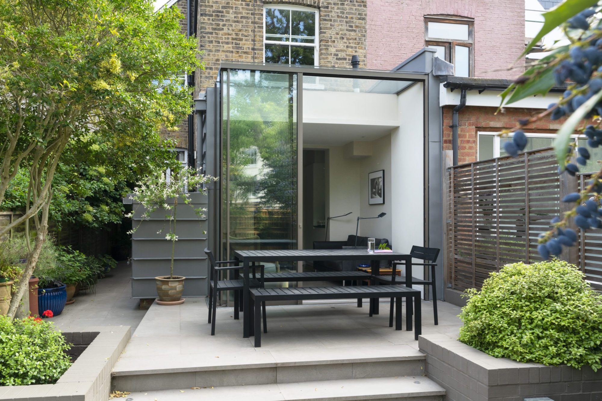 The handful of projects selected here are interesting as a group due to their proximity to each other and the similarity of their age and style, all being originally constructed in the late Victorian or Edwardian periods. Several others that we are working on in the vicinity have either recently gained planning permission or are in the early stages of the design process.The project was for a contemporary rear extension to serve as a conservatory/garden room and the re-building of the existing dark, isolated, kitchen area to provide a modern, bright, kitchen/dining room opening into the garden room. Key to the design was the flow of the garden room space into the garden through large glazed triple sliding doors that form part of a glass-box design and the re-landscaping of the garden to create a raised patio/dining area as an outdoor extension to the conservatory and kitchen.