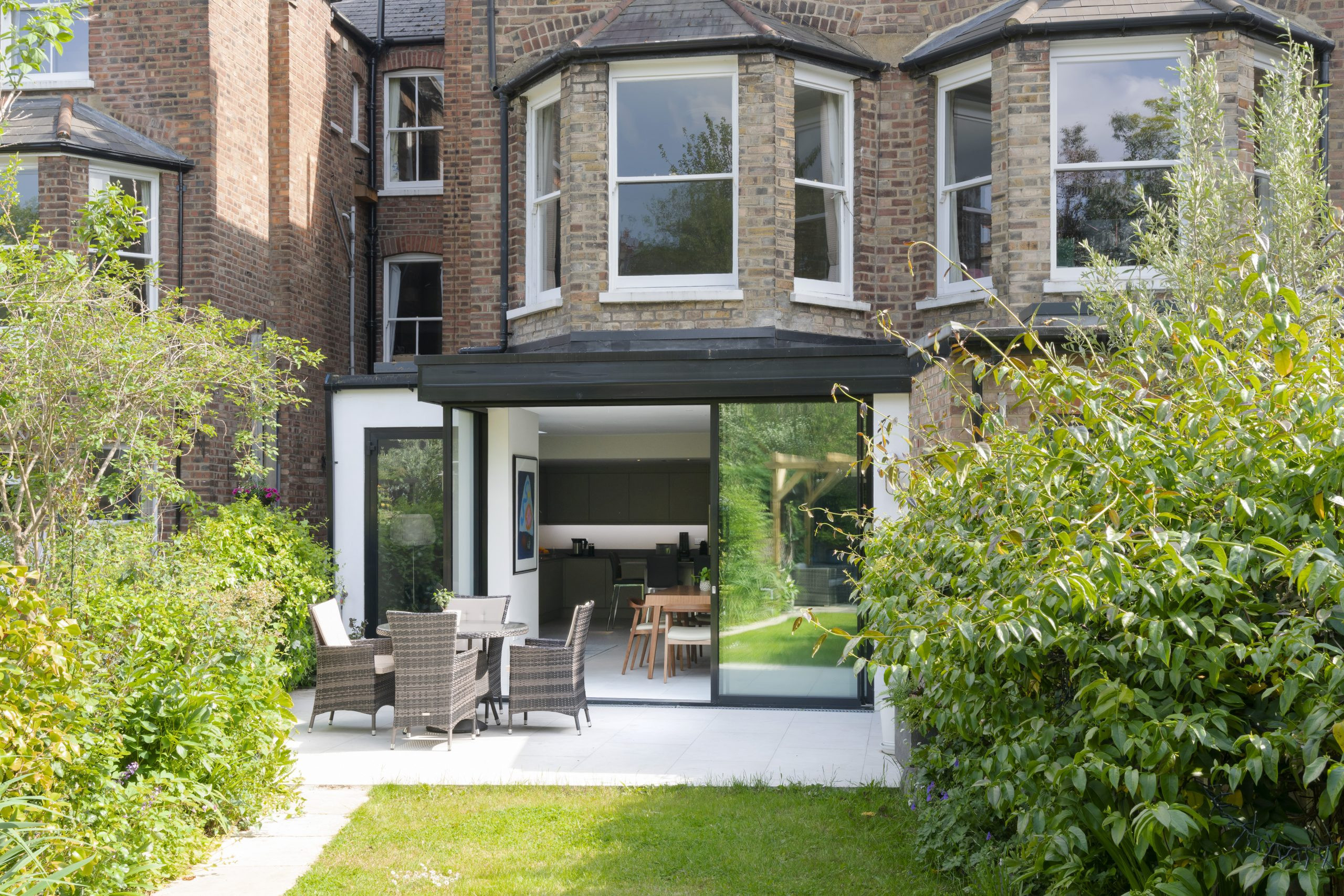 The handful of projects selected here are interesting as a group due to their proximity to each other and the similarity of their age and style, all being originally constructed in the late Victorian or Edwardian periods. Several others that we are working on in the vicinity have either recently gained planning permission or are in the early stages of the design process.The project was for a contemporary rear extension to serve as a conservatory/garden room and the re-building of the existing dark, isolated, kitchen area to provide a modern, bright, kitchen/dining room opening into the garden room. Key to the design was the flow of the garden room space into the garden through large glazed triple sliding doors that form part of a glass-box design and the re-landscaping of the garden to create a raised patio/dining area as an outdoor extension to the conservatory and kitchen.