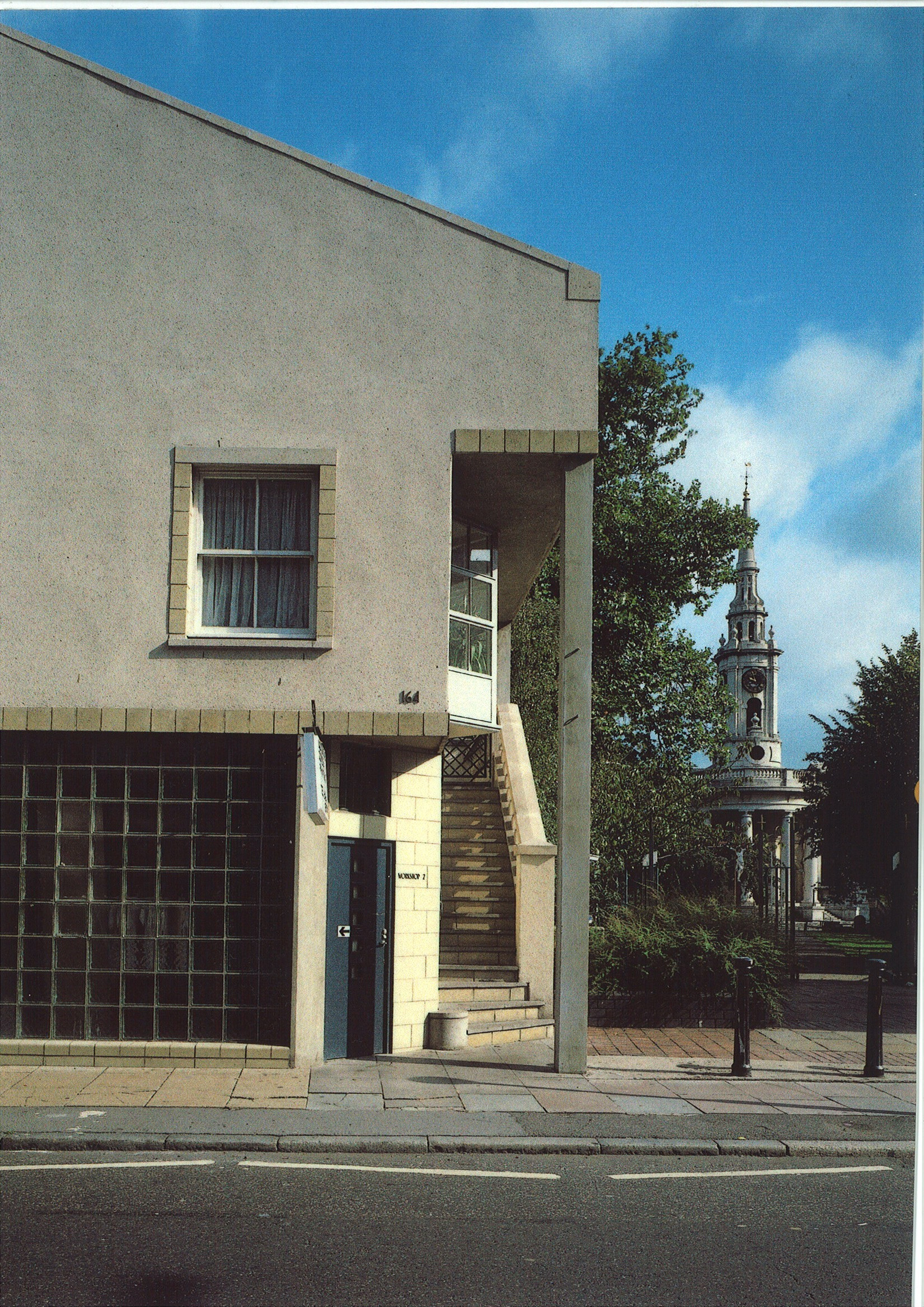 Stairs from the pavement lead up to a first floor terrace overlooking the churchyard from which the residential units are accessed. A clerestory gives light to the ground floor workshops, entered from the street on the opposite side of the building.