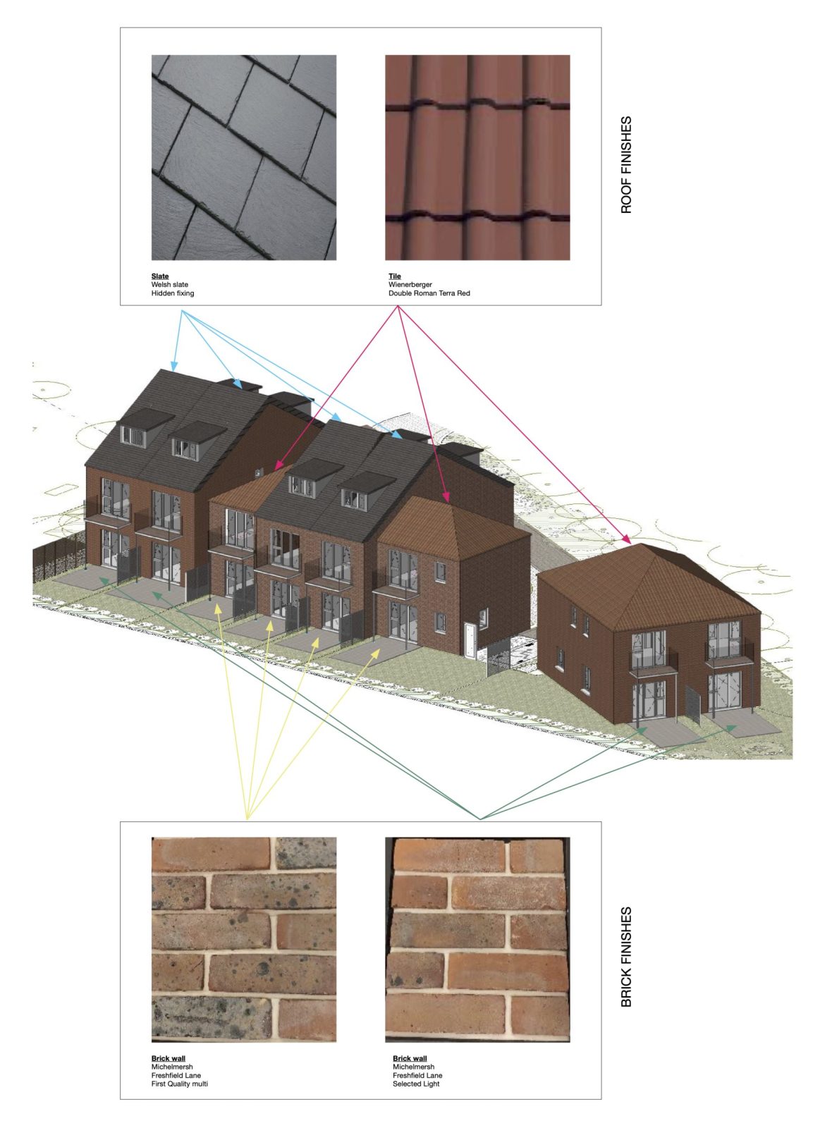 Our layout comprises a loosely arranged terrace of two storey 1 bed, 2 bed and 3 bed houses which meet the nationally described space standards and to achieve the mix required in the local planning policy. The 3 bed houses include accommodation in the roof space but the proposal maintains a mixed roof form giving variety and emphasis.