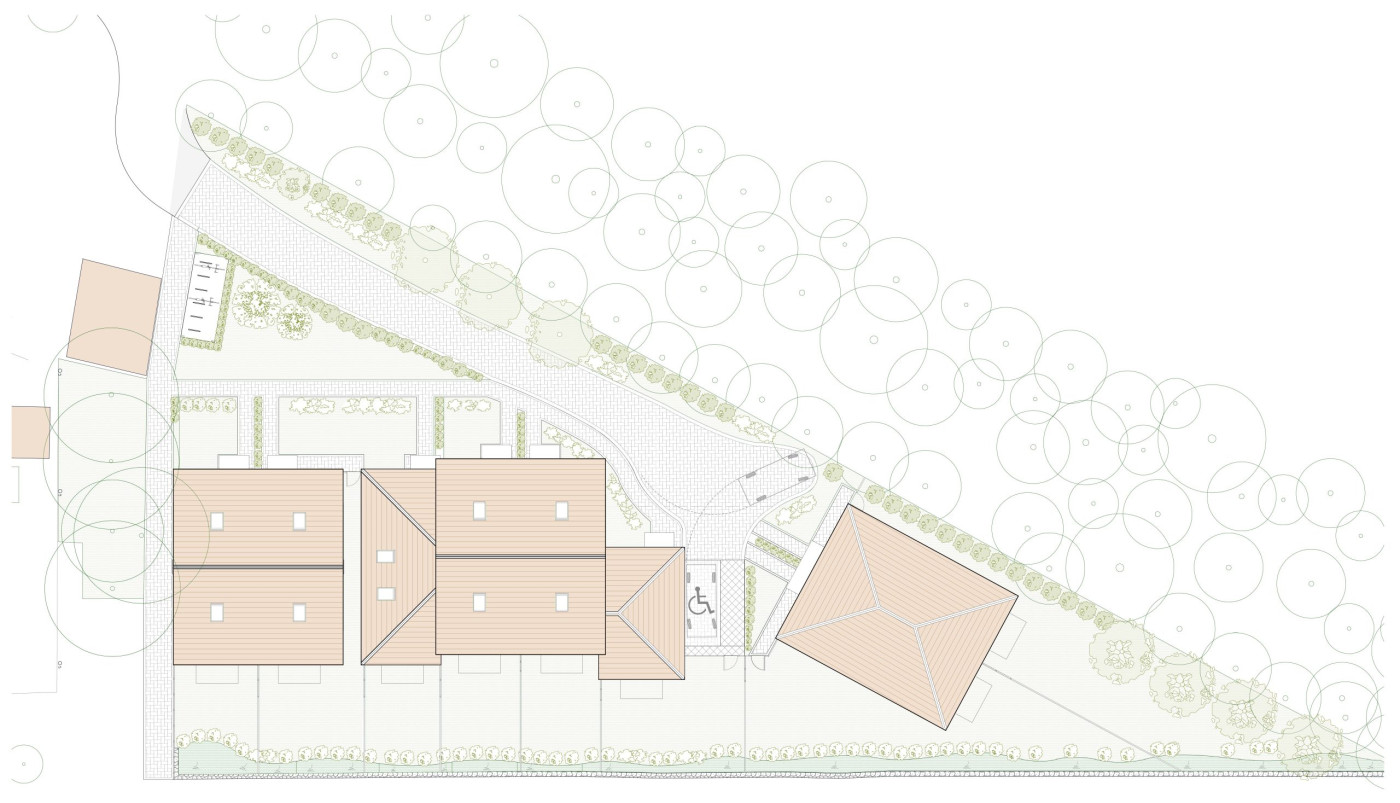 Haines Phillips Architects were appointed to prepare proposals for a housing development on a triangular piece of vacant land to the rear of existing buildings on Dover Road, Sandwich.