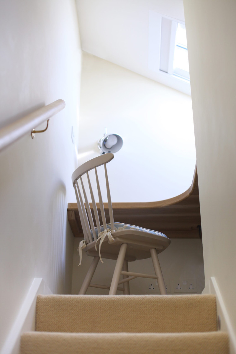 We transformed the former water tank space at the back of the “butterfly” roof in to a tiny but effective fitted study area.