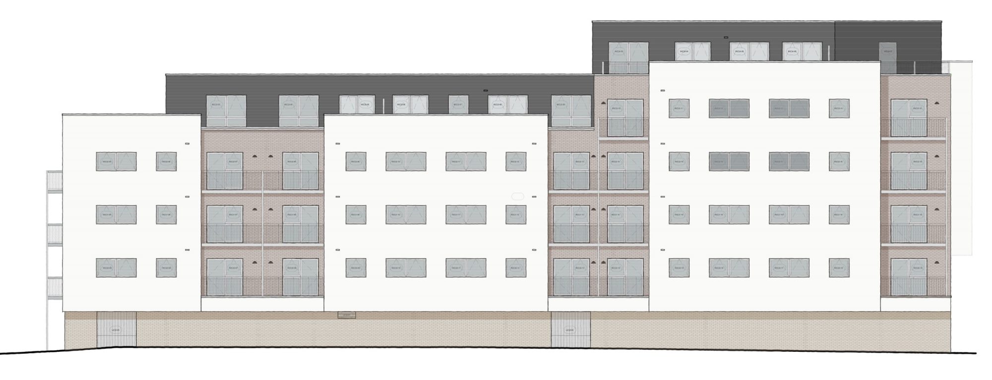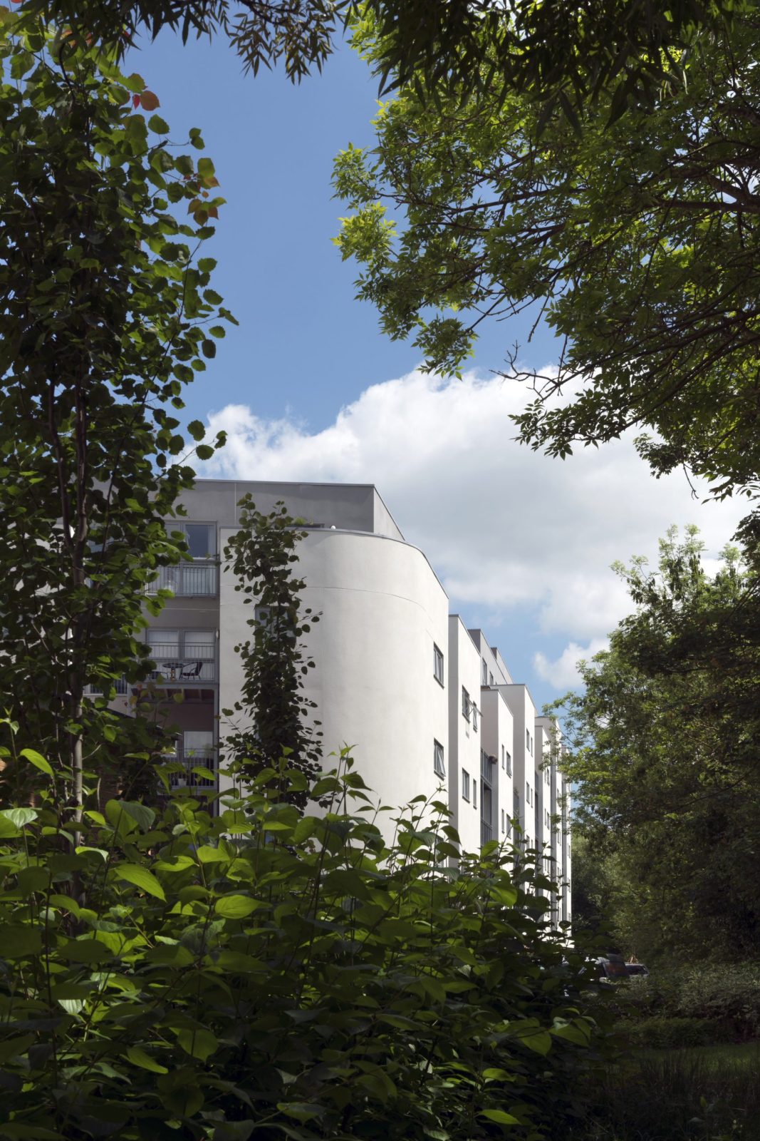 The large volumes of the apartment blocks are stepped and articulated, and a limited palette of low-maintenance external materials used to break down the scale in to smaller elements and to provide external aspect and amenity space for every apartment.