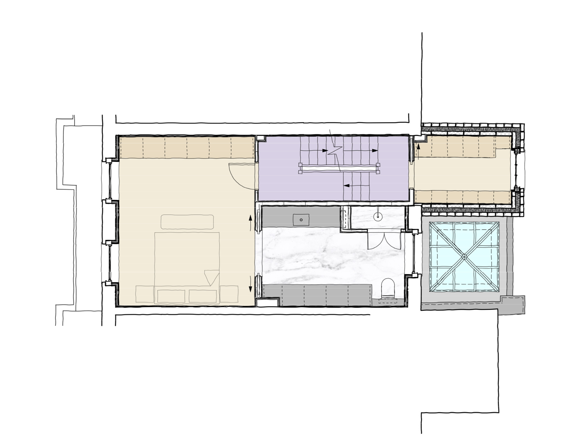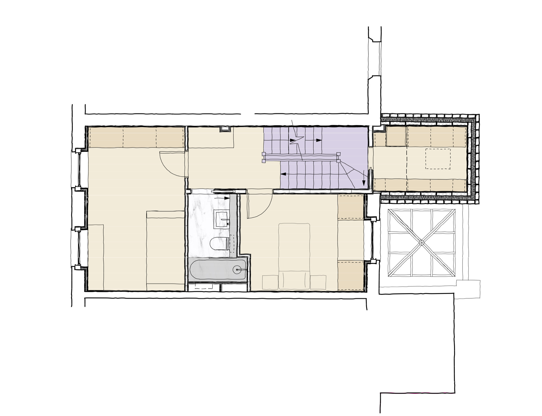 The existing rear closet wing is to be rebuilt to a larger size, and a infill extension at lower ground and ground floors provides valuable additional floor space. Ancillary utility room and dressing room spaces are squeezed in to the upper floors of the closet wing. Five bedrooms have been inserted within the upper floors, including two bedrooms in a third floor mansard roof extension.