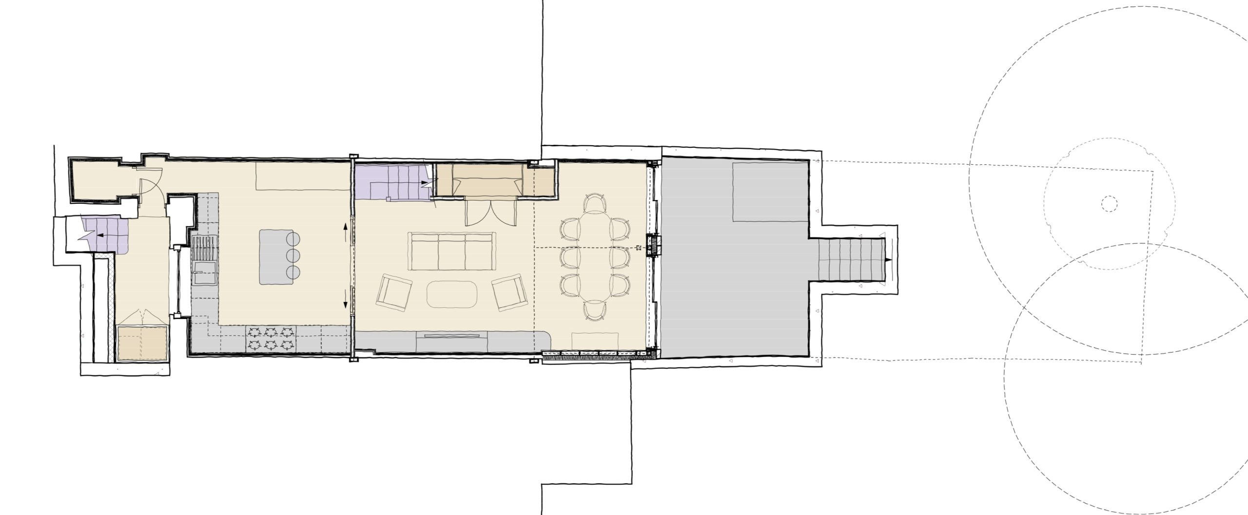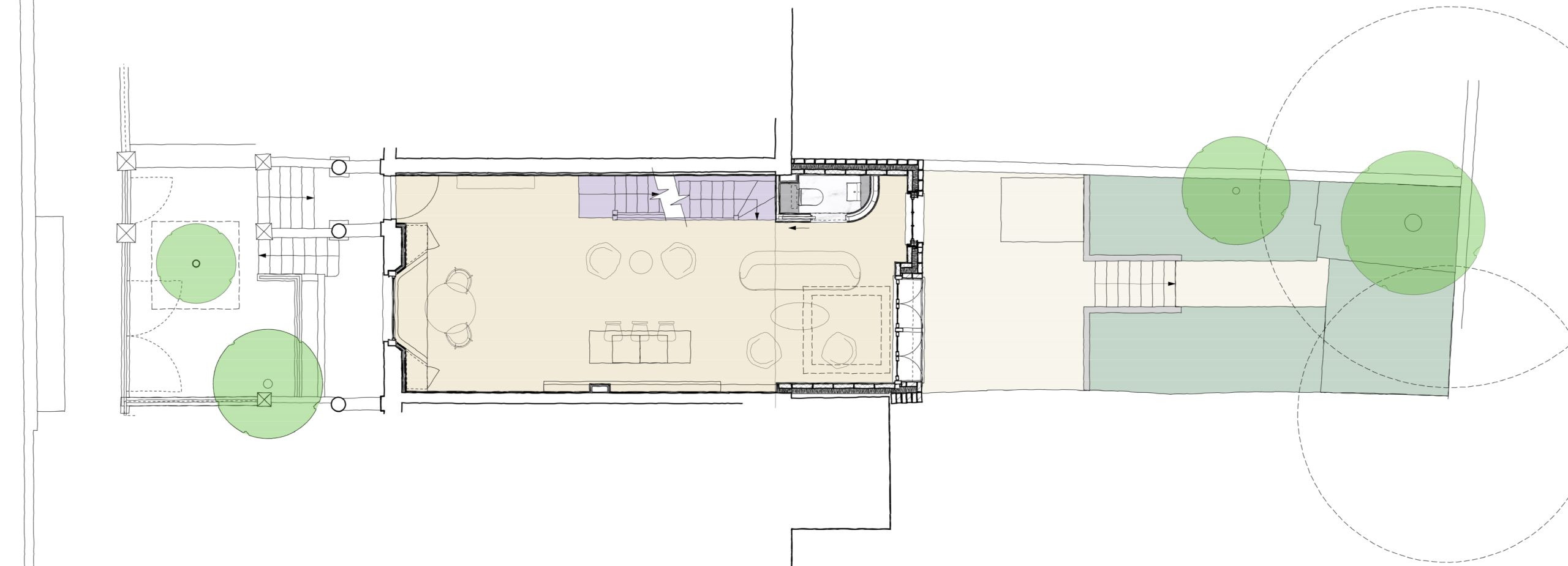 Our design proposals included a completely new internal layout, with the living spaces in an open plan ground floor, and the kitchen and dining spaces in the lower ground floor with a lowered floor in order to improve the floor to ceiling height.