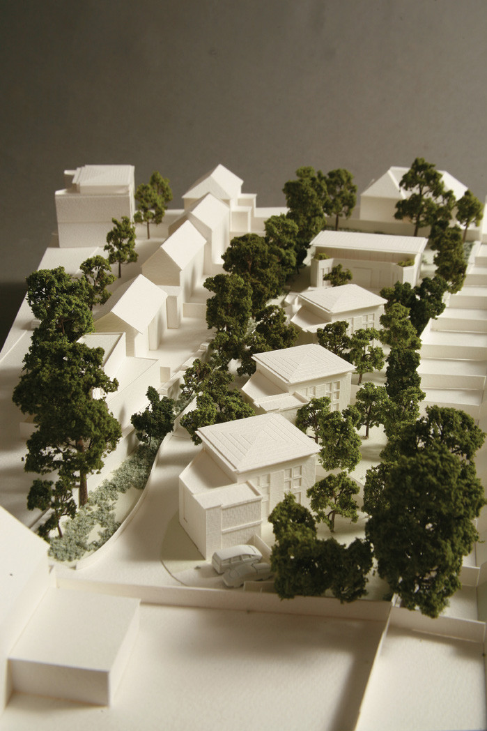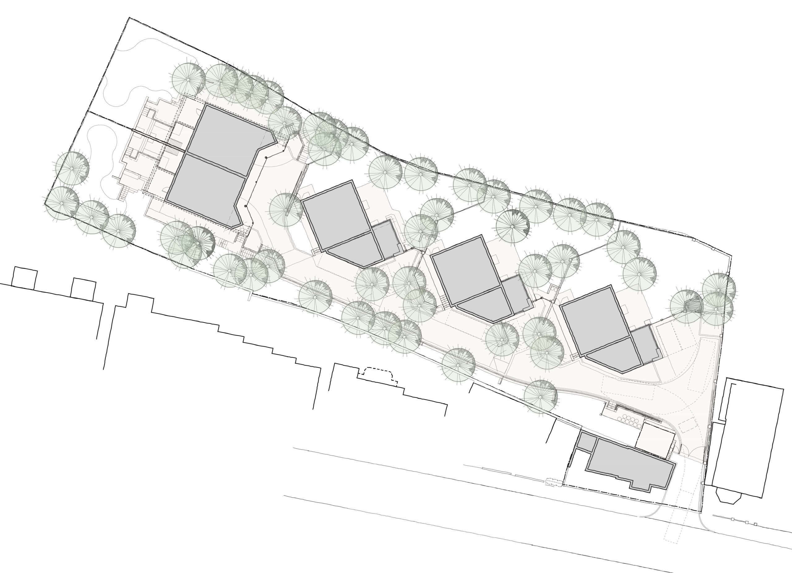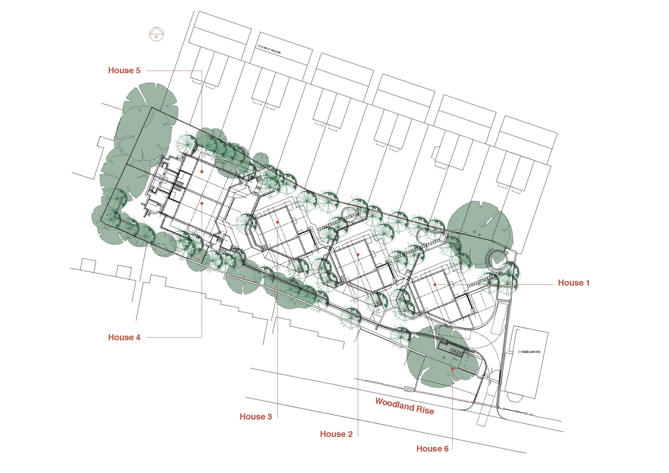 Our design comprises three detached and two semi-detached houses, each with private gardens and terraces.