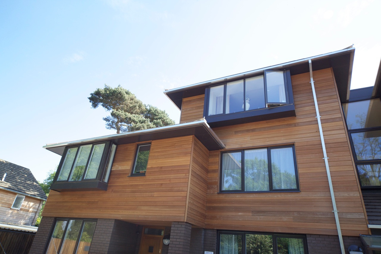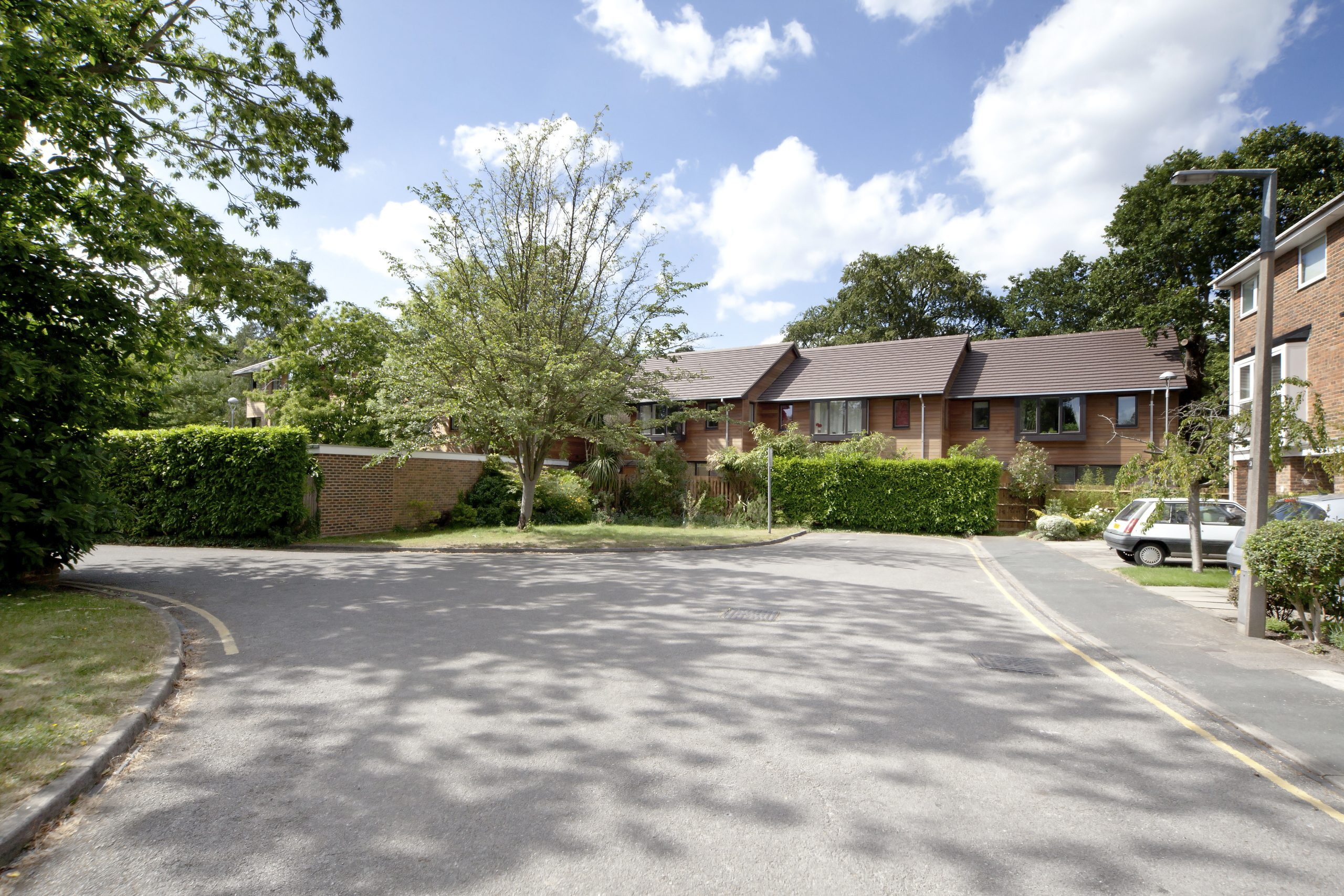 The building mass is strongly modelled with changes of plane, deep roof overhangs and projecting bay windows characteristic of residential properties in the area. Dark brick and pale timber cladding is designed to allow the buildings to recede within the fine landscape setting of the site.