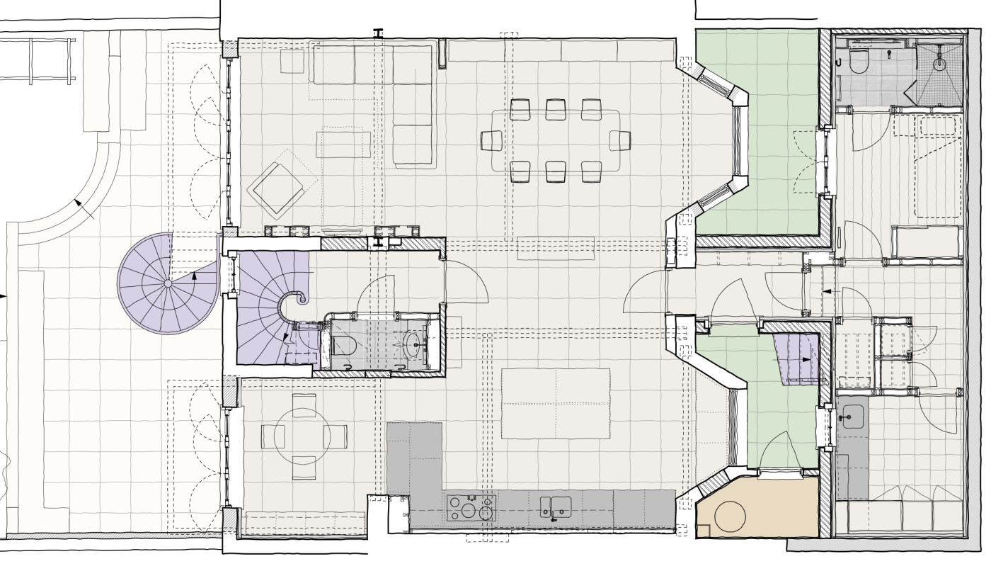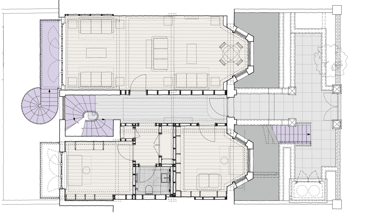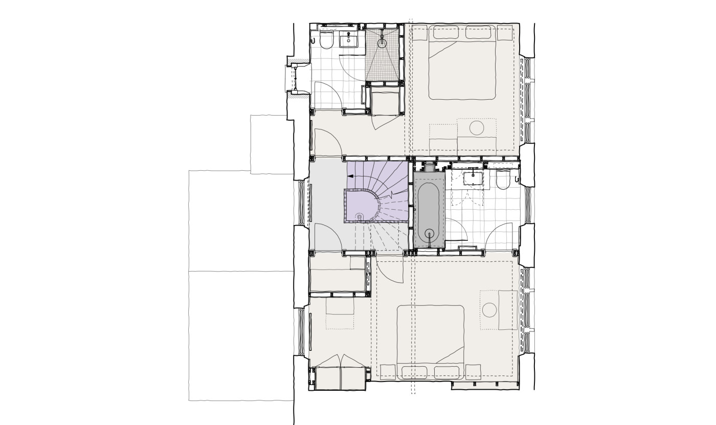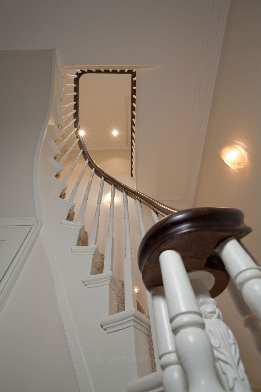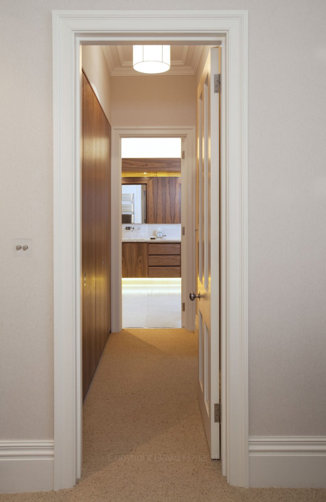 Period detailing was re-instated to the primary fabric of the house including the new staircase, whilst the internal fit-out – bathrooms, kitchen, dressing rooms, fireplaces and joinery – was designed in a pared-down contemporary style.