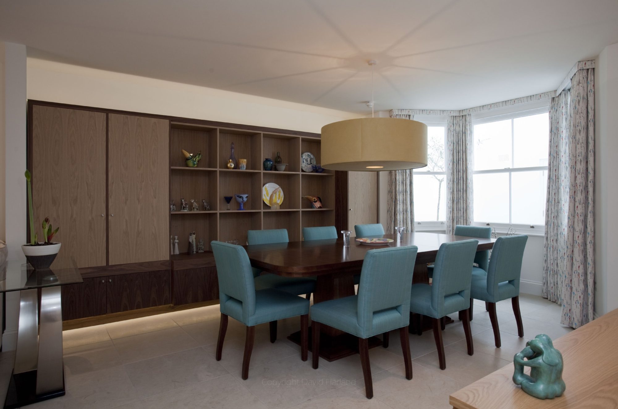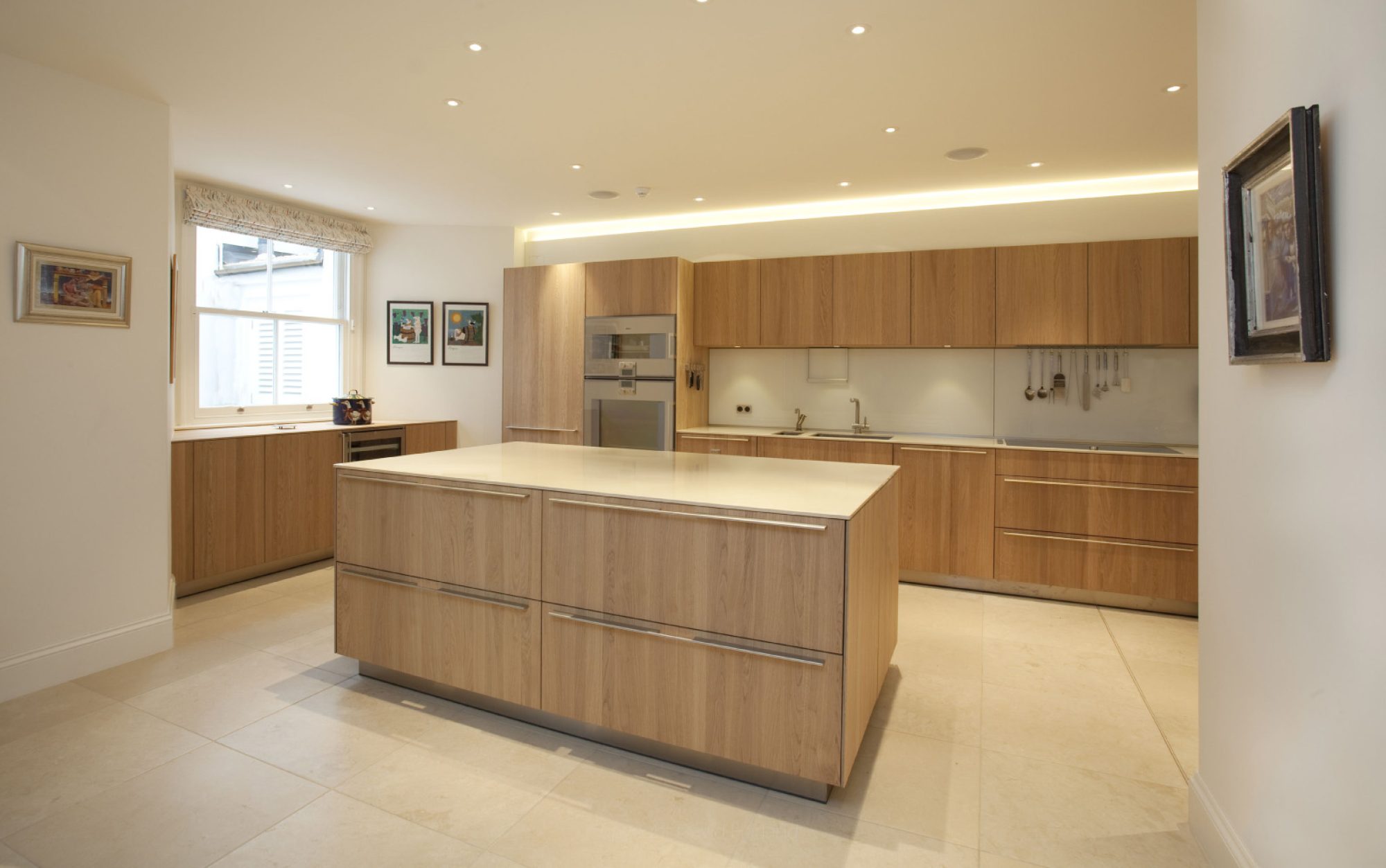 The cellular basement rooms were converted into a light and spacious open-plan kitchen, dining and sitting room as part of the new internal refurbishment and fit-out following the complete demolition of the existing internal fabric.