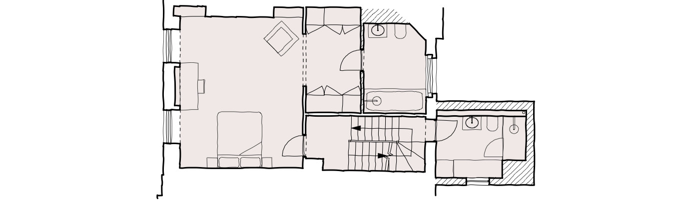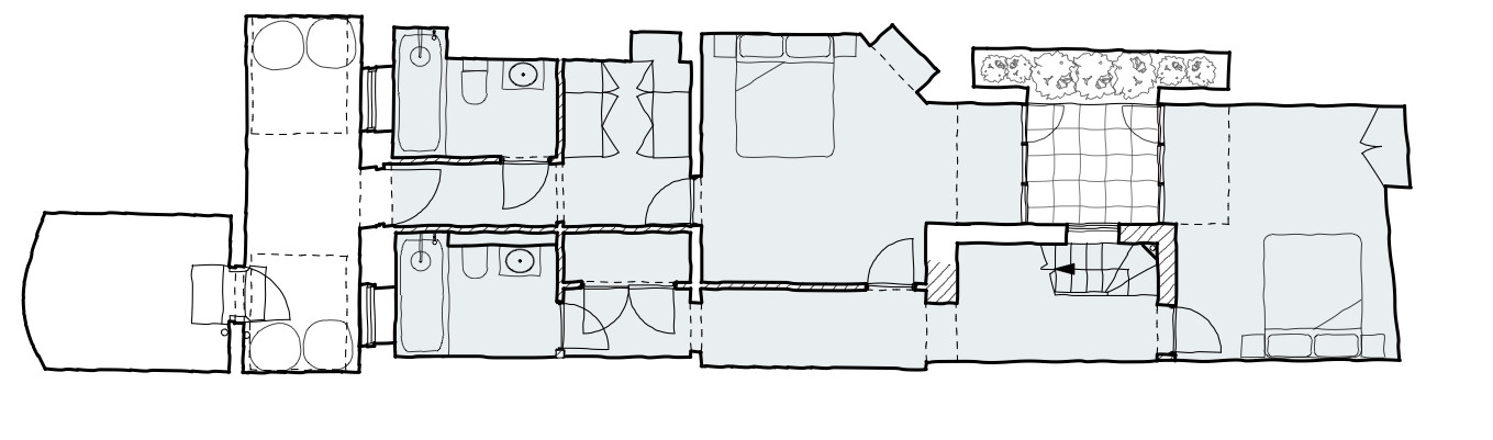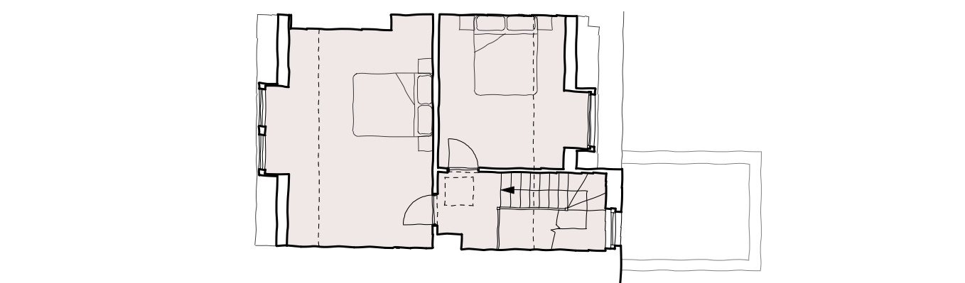 Closet wing extensions at first and second floors provide an access route to a first floor terrace for flat 2 and for a new bathroom for flat 1.