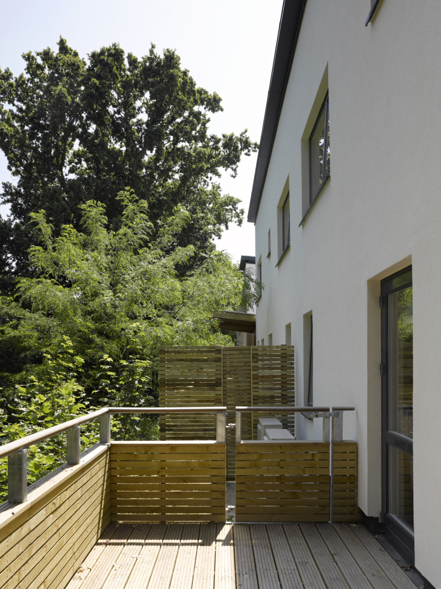 The six ground-floor units provide wheelchair-standard accommodation including adapted kitchens and bathrooms, level-access front and rear terraces, covered car-ports and two units with additional space for live-in carers. Advantage is taken of the larger footprint required for these units to provide private roof terraces for the first floor flats, which are all designed to Lifetime Homes standards.