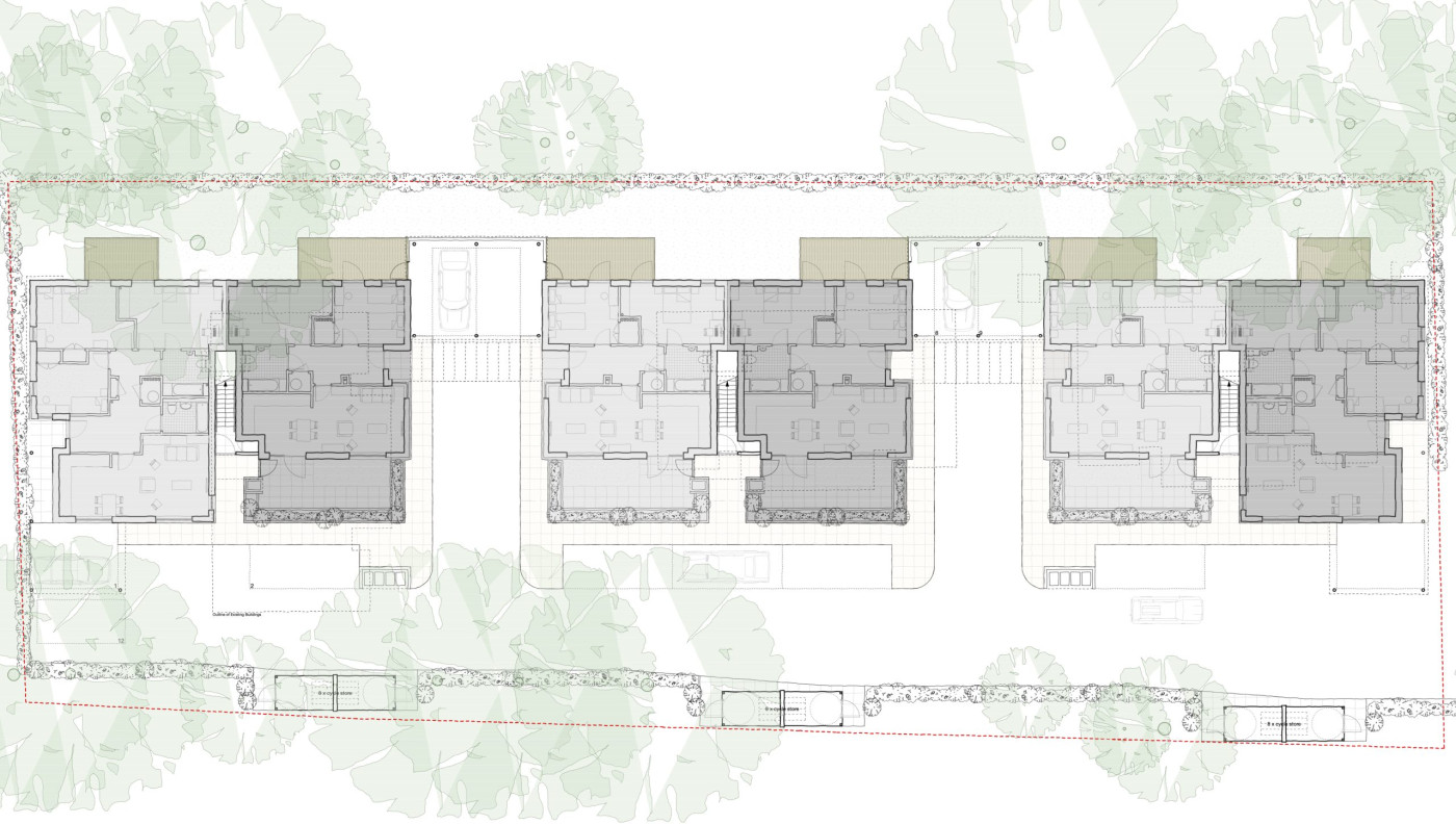 The site layout had to provide full wheelchair access to all units at ground floor level while also raising the ground floor 300mm above the existing site level to guard against flood risk.