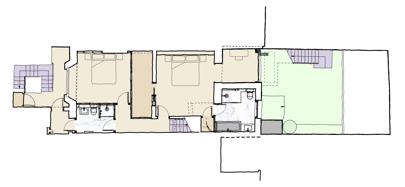 The lower ground floor spaces were reorganised to include two good size double bedrooms, two bathrooms, ample storage space and a study area facing out on to the rear garden patio.