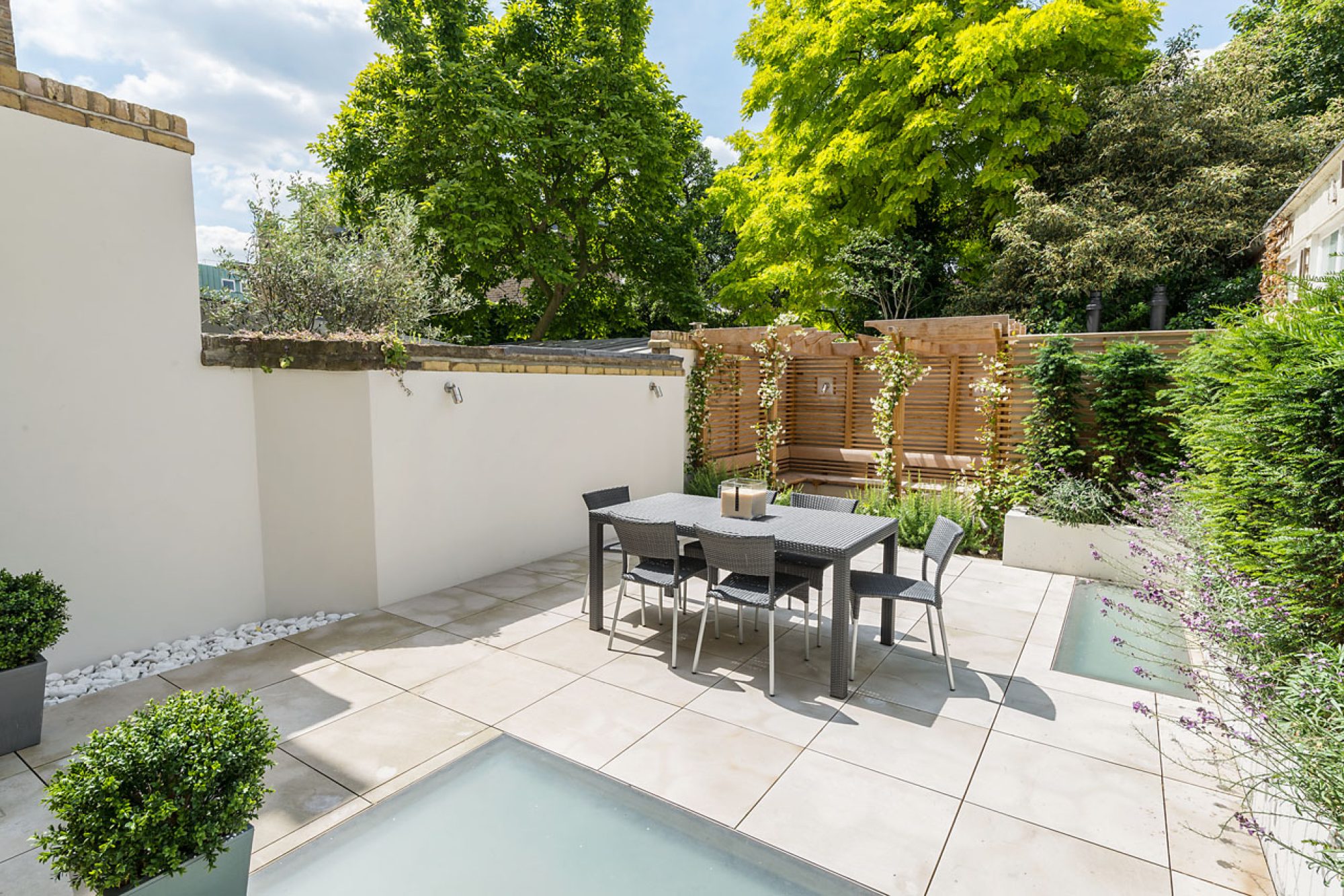 Our design included the rear garden landscaping which is based around a flexible patio space and a simple, low maintenance series of planting and seating areas.