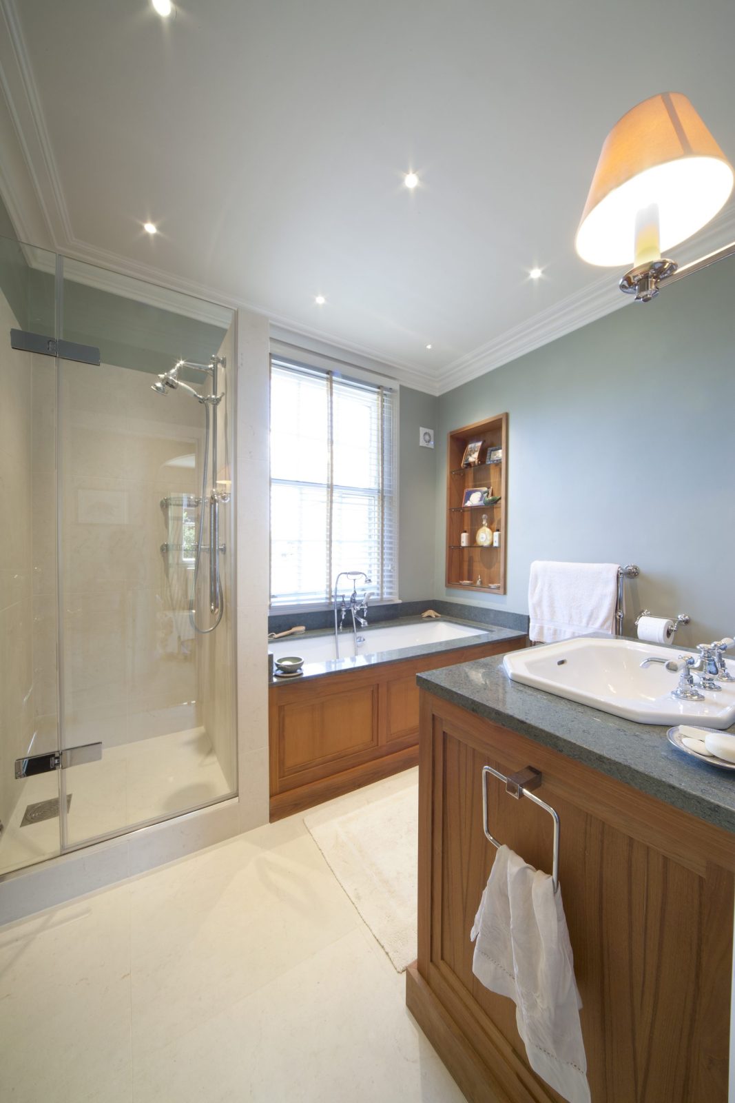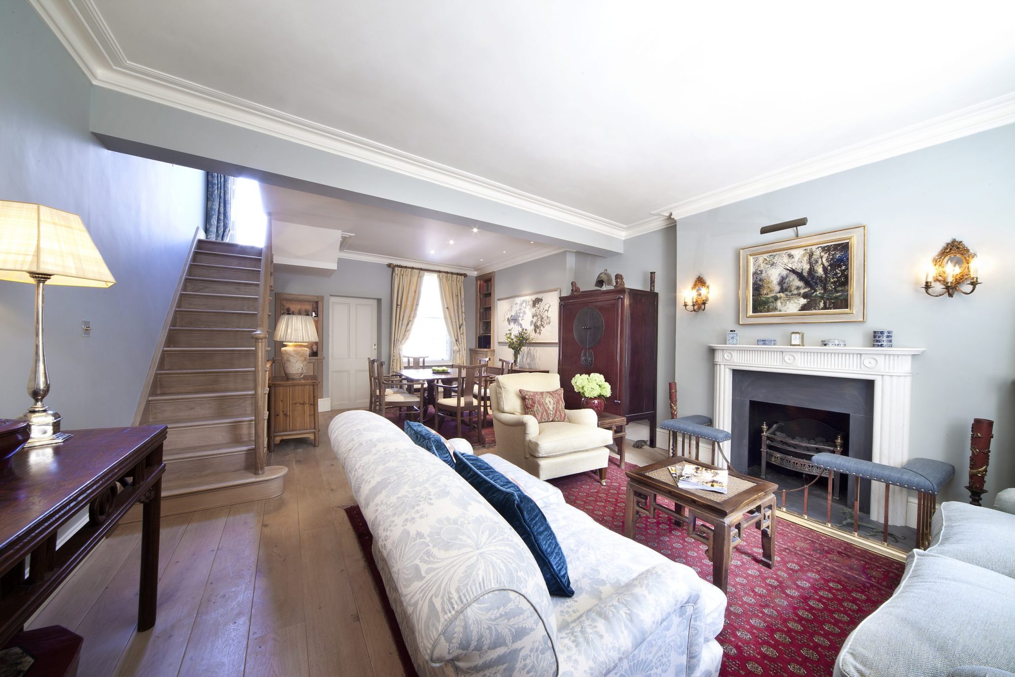 The lower ground floor with its almost minimalist interior and small paved garden is but a few steps from a ground floor living area with retained original cornices and panel doors and a