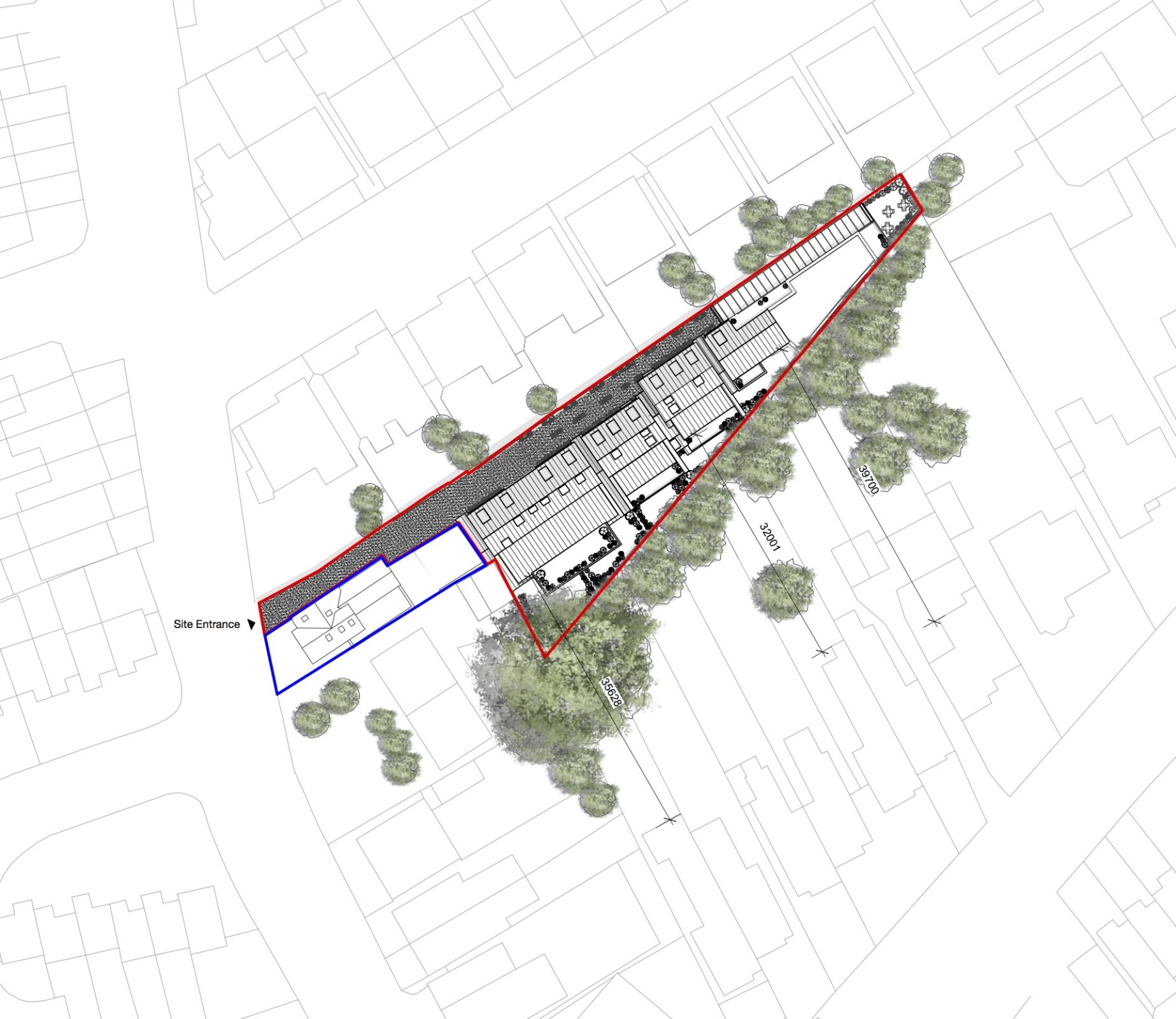 The triangular site was previously occupied by redundant workshop and garage spaces and is accessed from the via a narrow driveway. The main body of the site lies between the rear gardens of two rows of houses to the north and south.