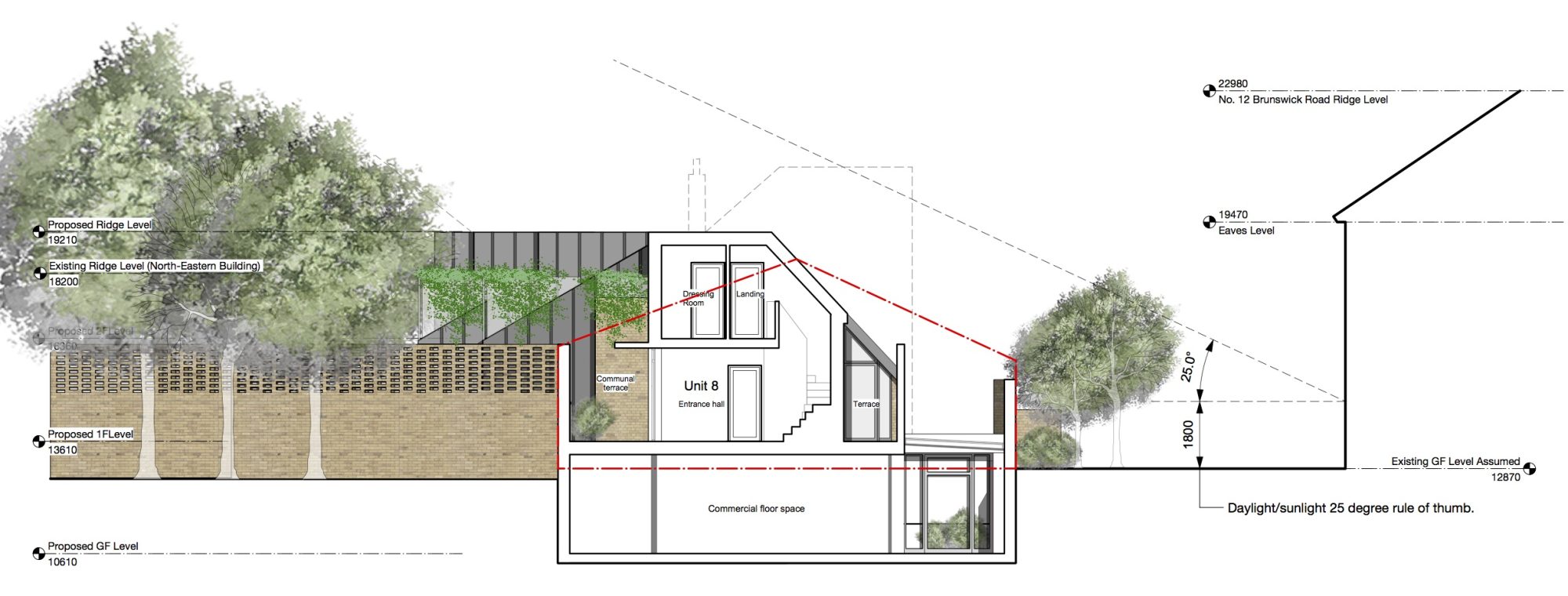 Our proposed design was for a mews style development of 9 new homes over a flexible commercial space at ground floor level. The homes are a mixture of 1, 2 and 3 bed units and include generous amenity space.