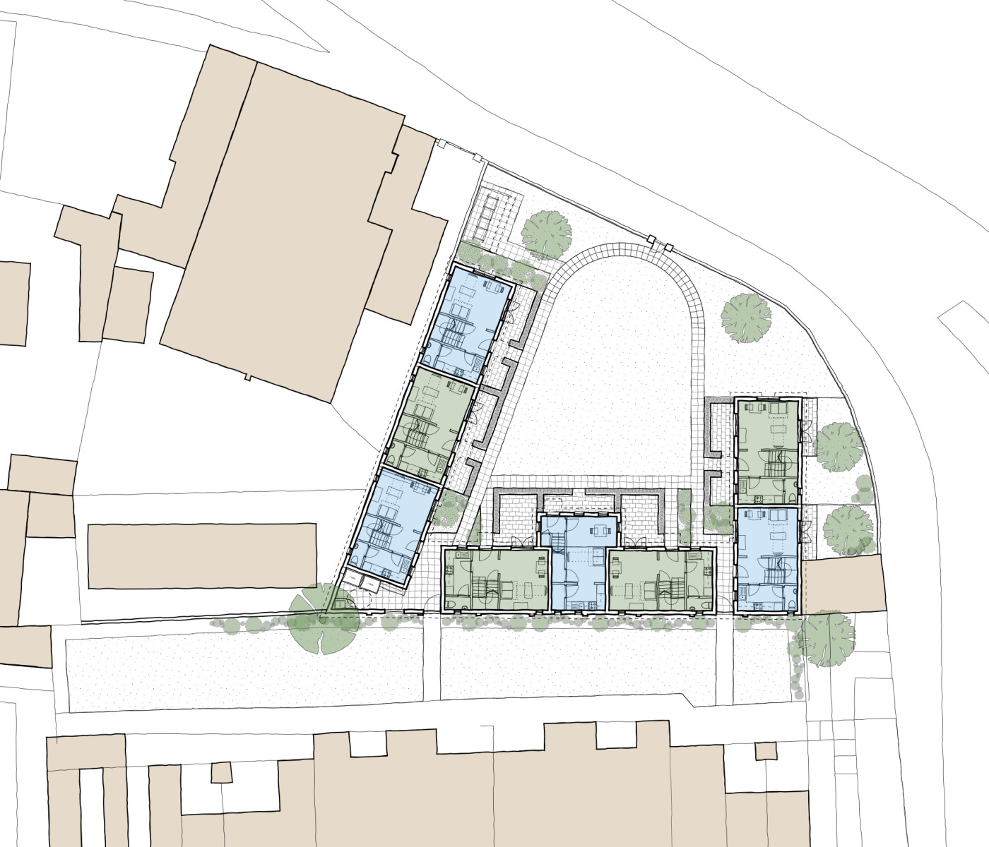 The common garden area in the courtyard functions as shared amenity space for the residents of the new homes and other residents on the estate.