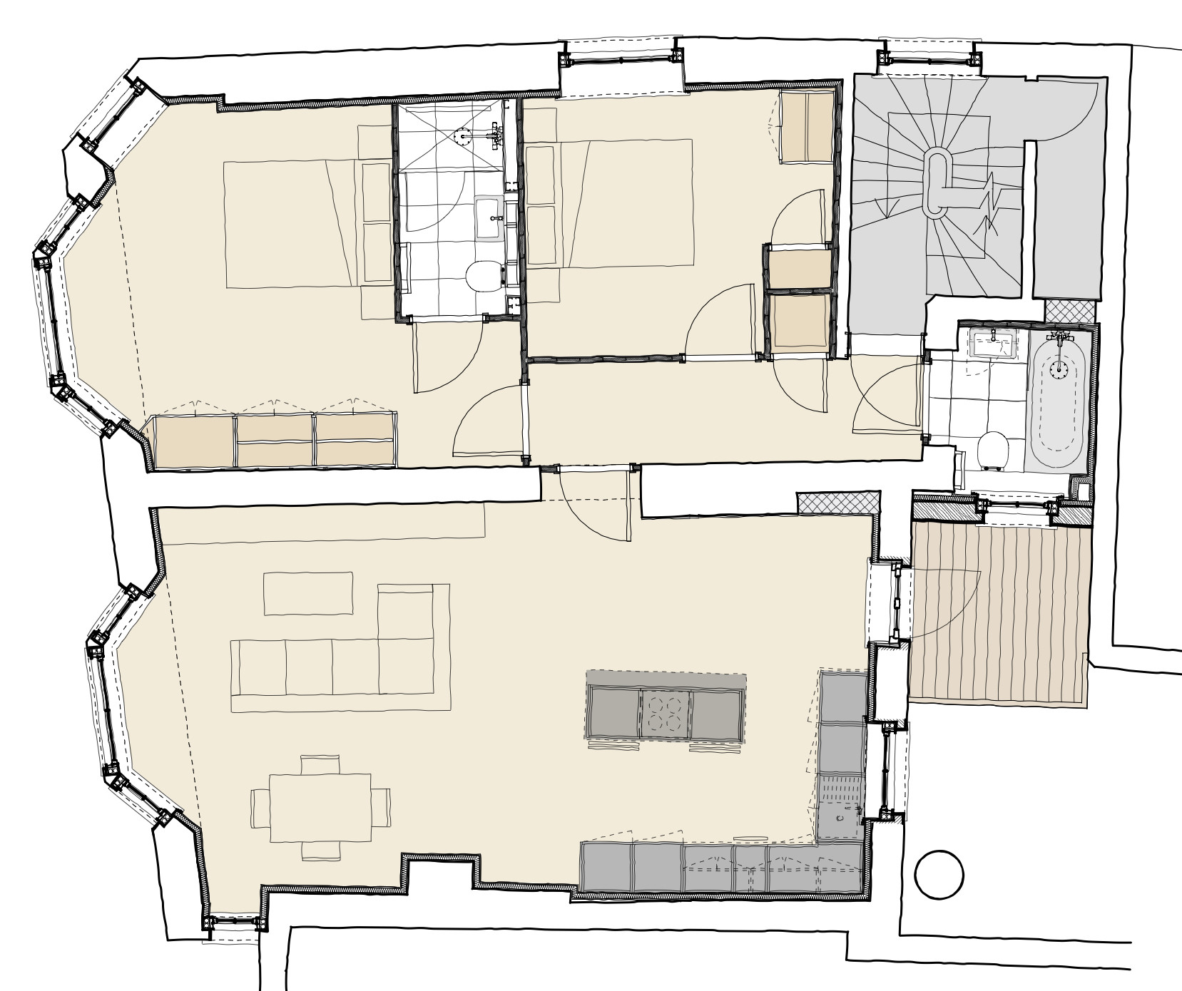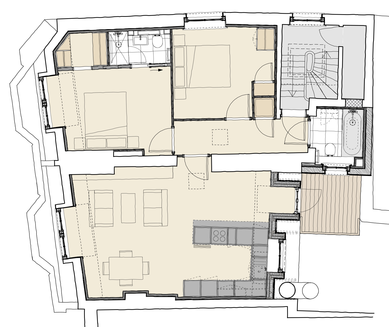 Working with a modest budget, the details and finishes for each flat create a contemporary, high quality design that makes subtle references to period details appropriate to the original building.