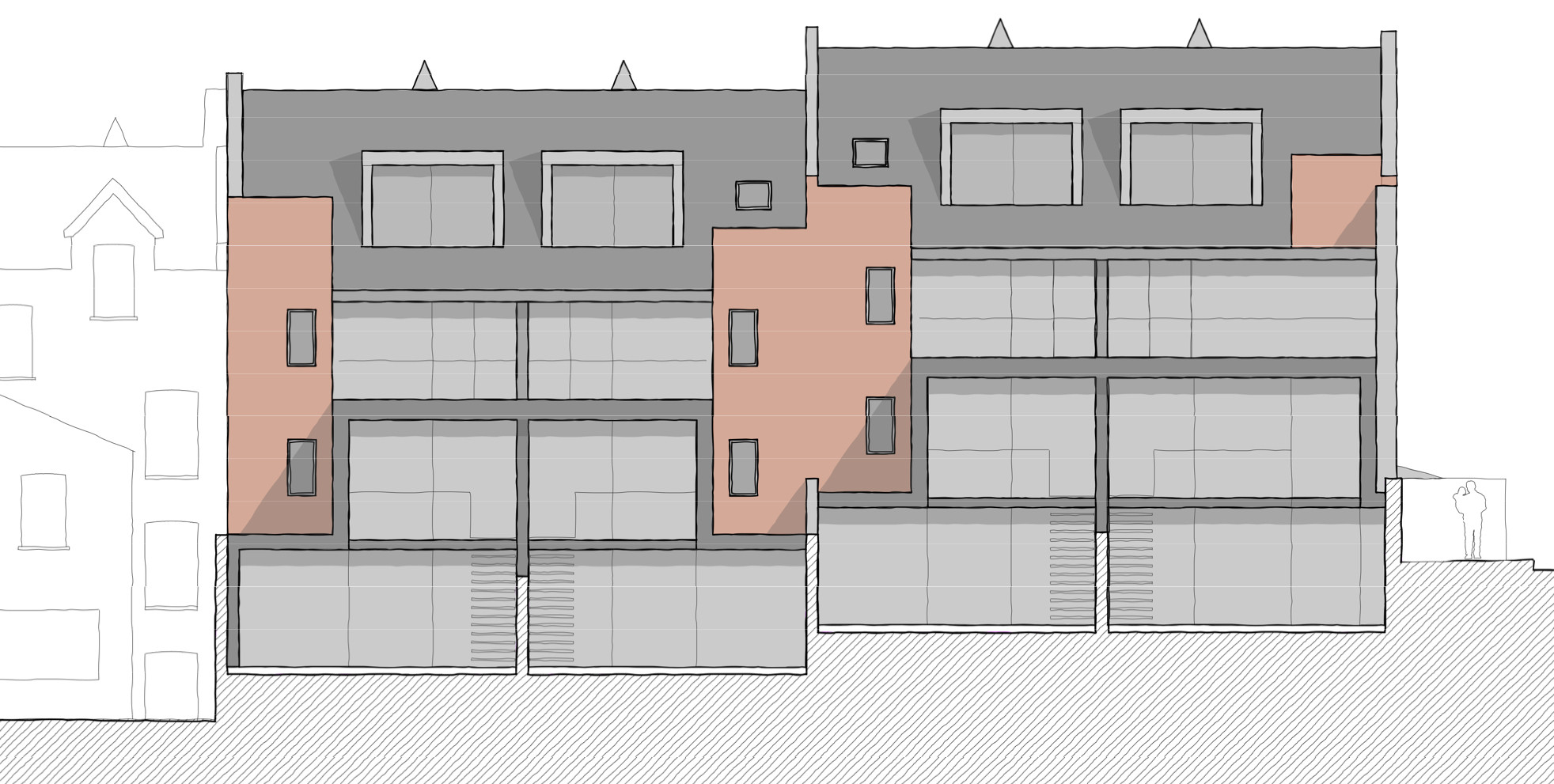 Our design is based on a modern interpretation of the adjoining family houses on Briston Grove. The new houses are arranged over 4 levels from lower ground to second floor level. The houses are stepped in pairs and are cut into the slope of the hill to allow off-street parking to be provided at lower ground floor level for each house.