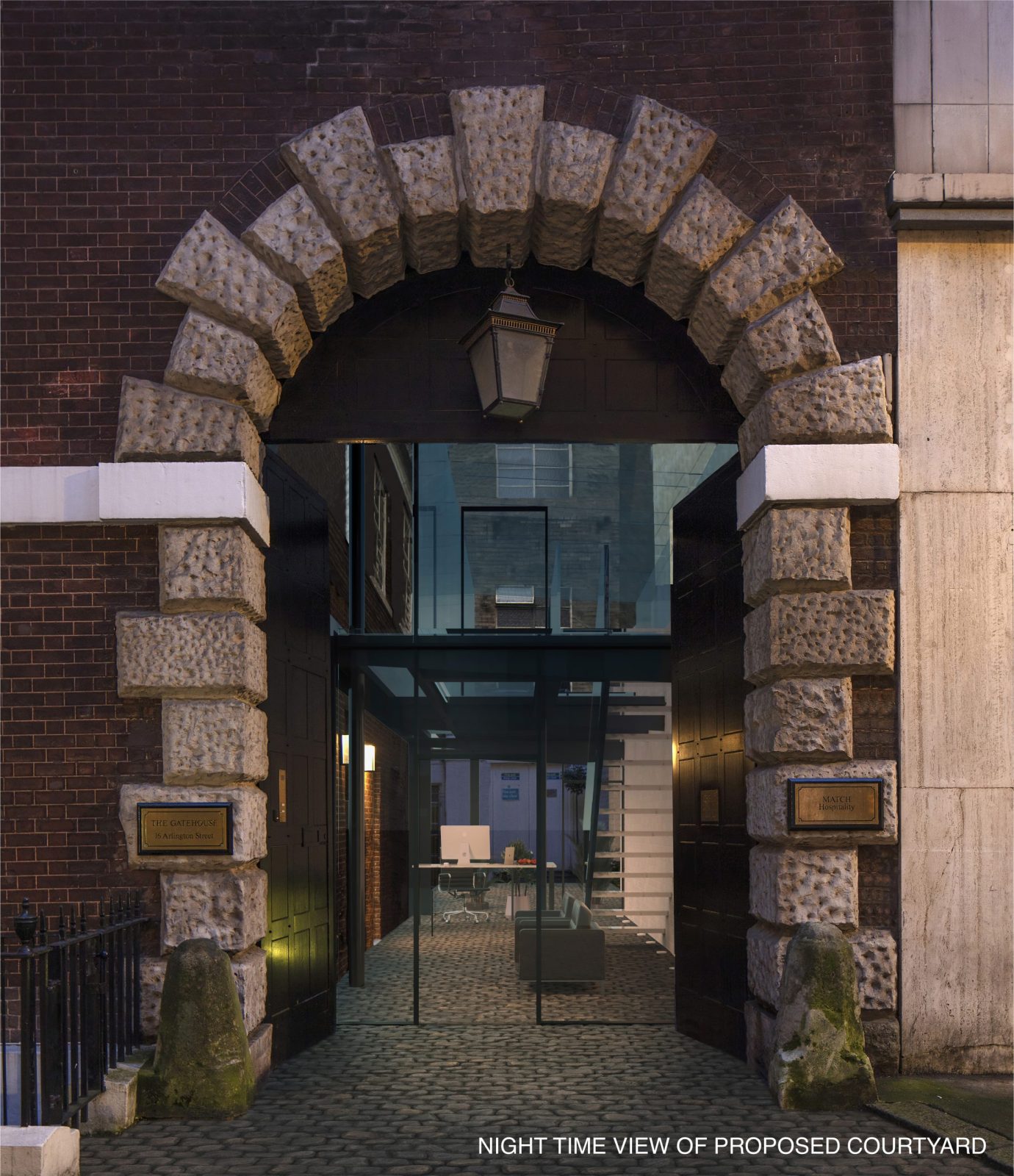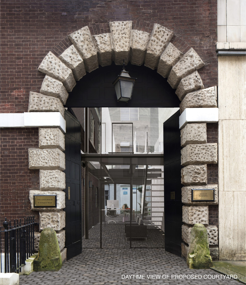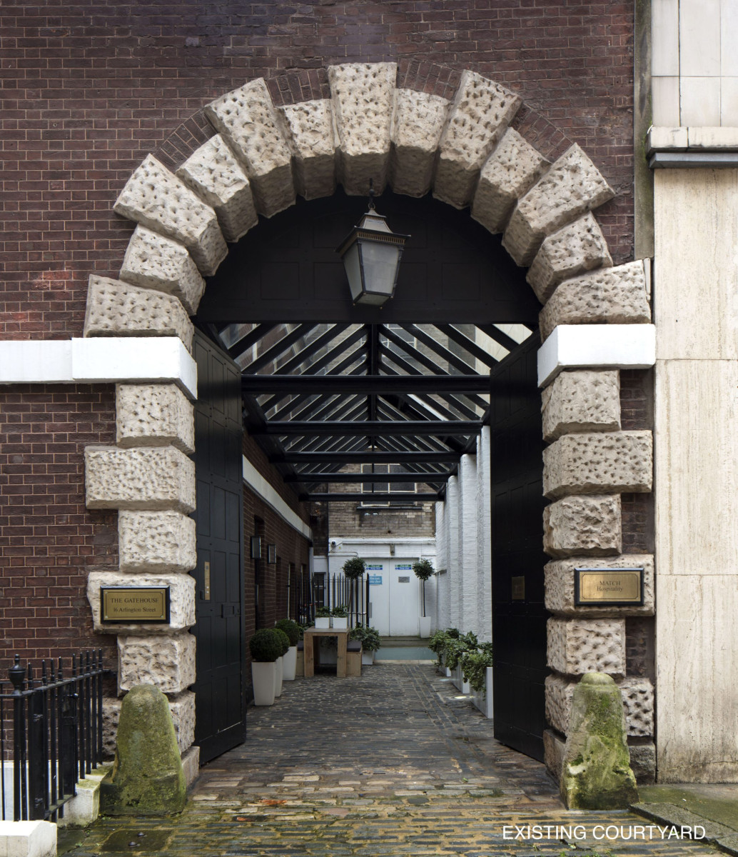 The building is the former gatehouse to Rutland House, originally built between 1734 and 1740 in the St. James’s conservation area of the City of Westminster. The eastern boundary of the courtyard consists of a high wall with a rusticated archway in the Gibbs style with large gates on to Arlington Street.