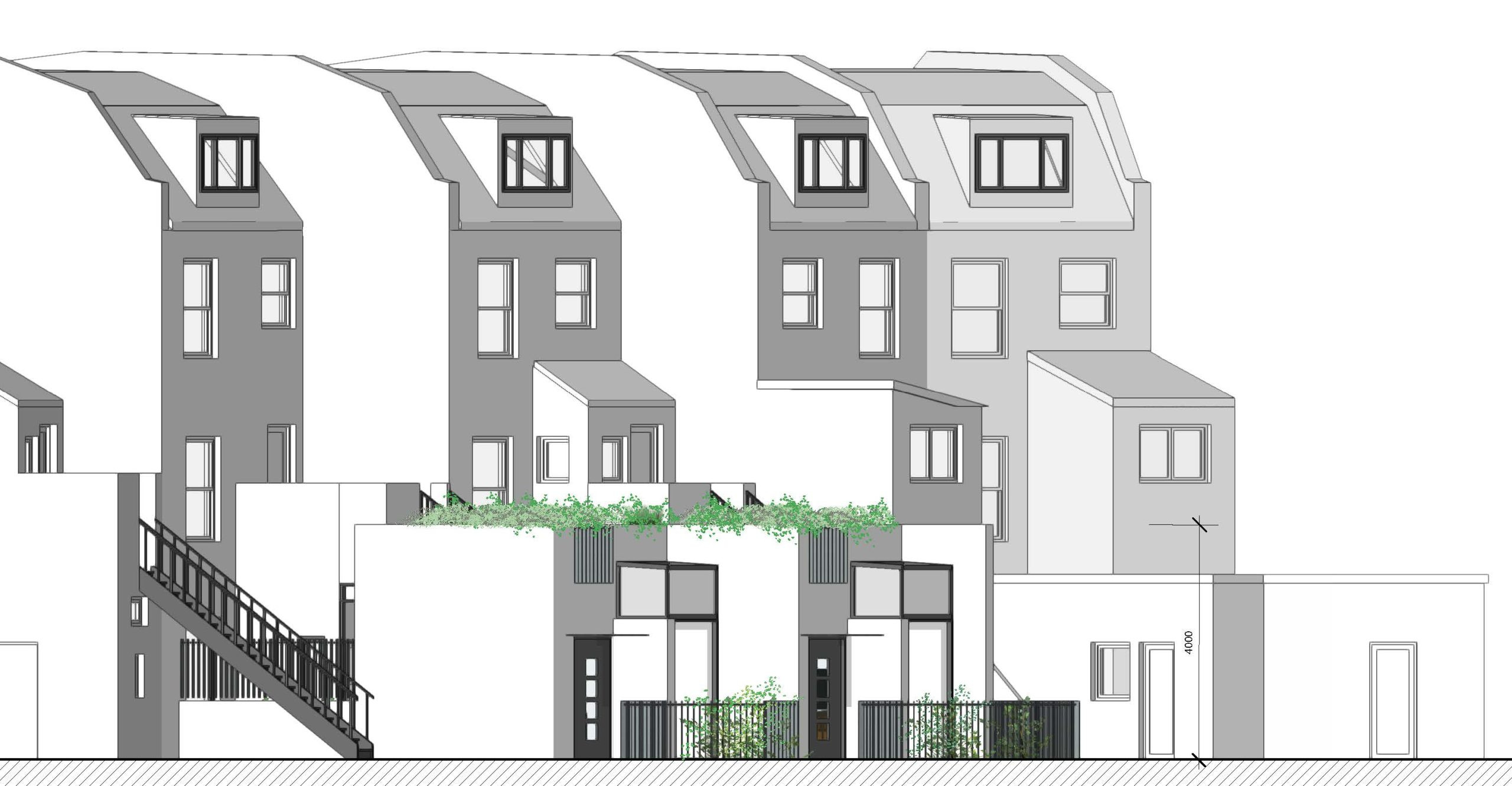 The contemporary appearance of the buildings will use high quality materials and will act to regenerate the rather neglected surroundings. Planting is proposed to the raised terraces overlooking along the laneway and also along it, in order to improvement the environment of the mews.